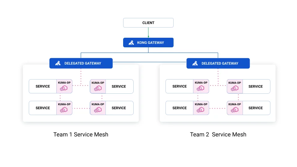 The below visualization shows the difference between delegated and builtin gateways. The blue lines represent traffic not managed by Kuma.